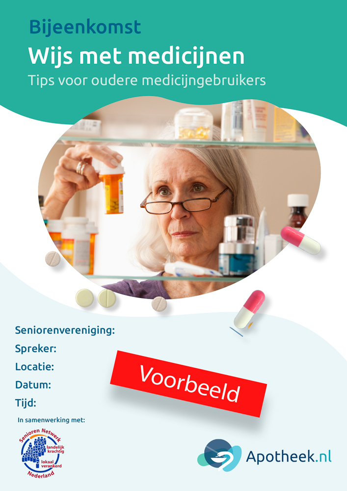 De bijeenkomsten 'Wijs met medicijnen’ geven oudere medicijngebruikers praktische tips en laat hen zien wat er achter de schermen in de apotheek gebeurt wanneer een recept binnenkomt. Met de poster ‘Bijeenkomst Wijs met medicijnen’ kunnen apothekers ouderen attent maken op de voorlichtingsbijeenkomsten in hun regio over veilig medicatiegebruik. De bijbehorende voorbeeldpresentatie en brochure kan tijdens deze bijeenkomsten worden gebruikt.